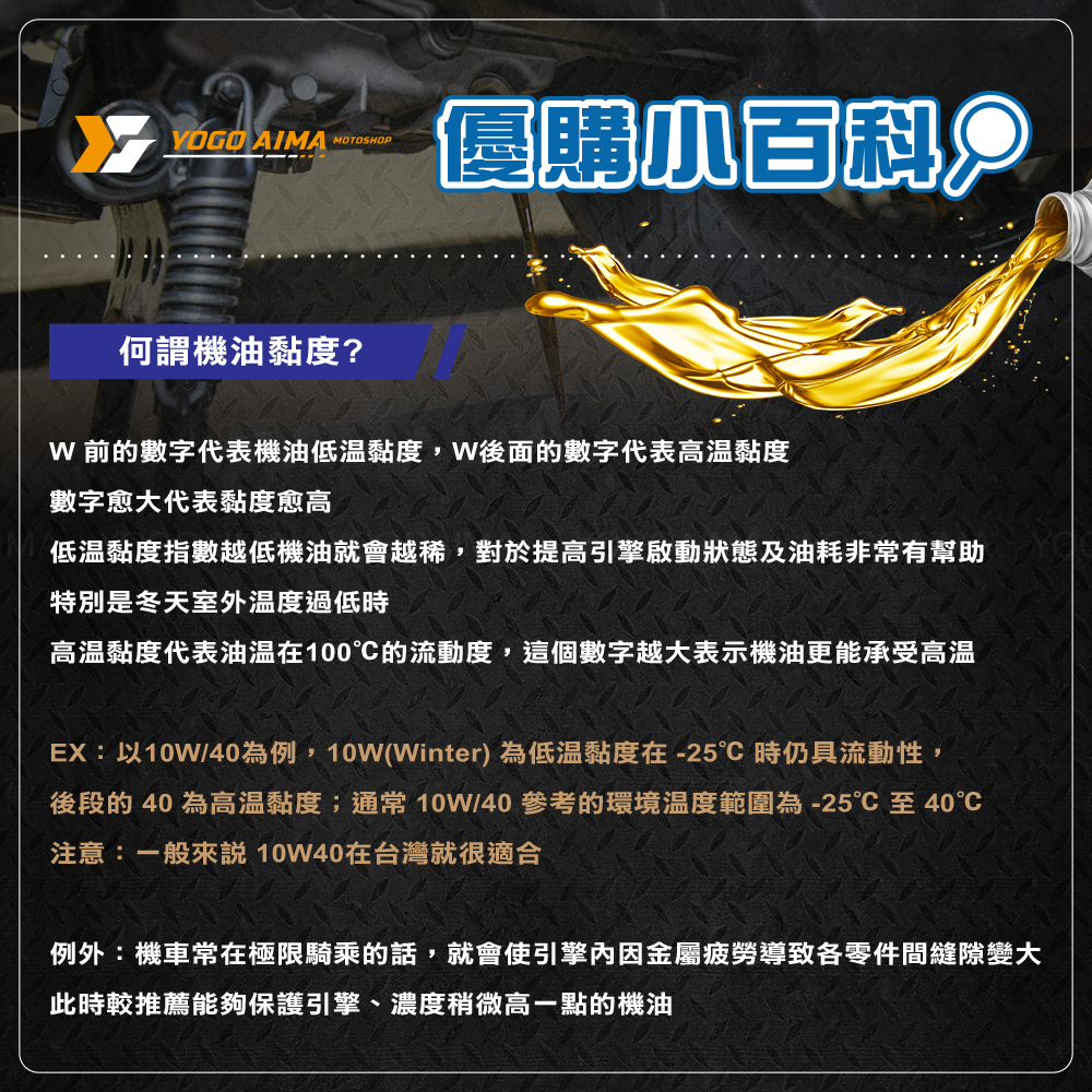 • 注意:依照製造商的建議選擇黏度等級,對於高速行駛(例如大型重機),建議使用黏度等級SAE 15W-50。