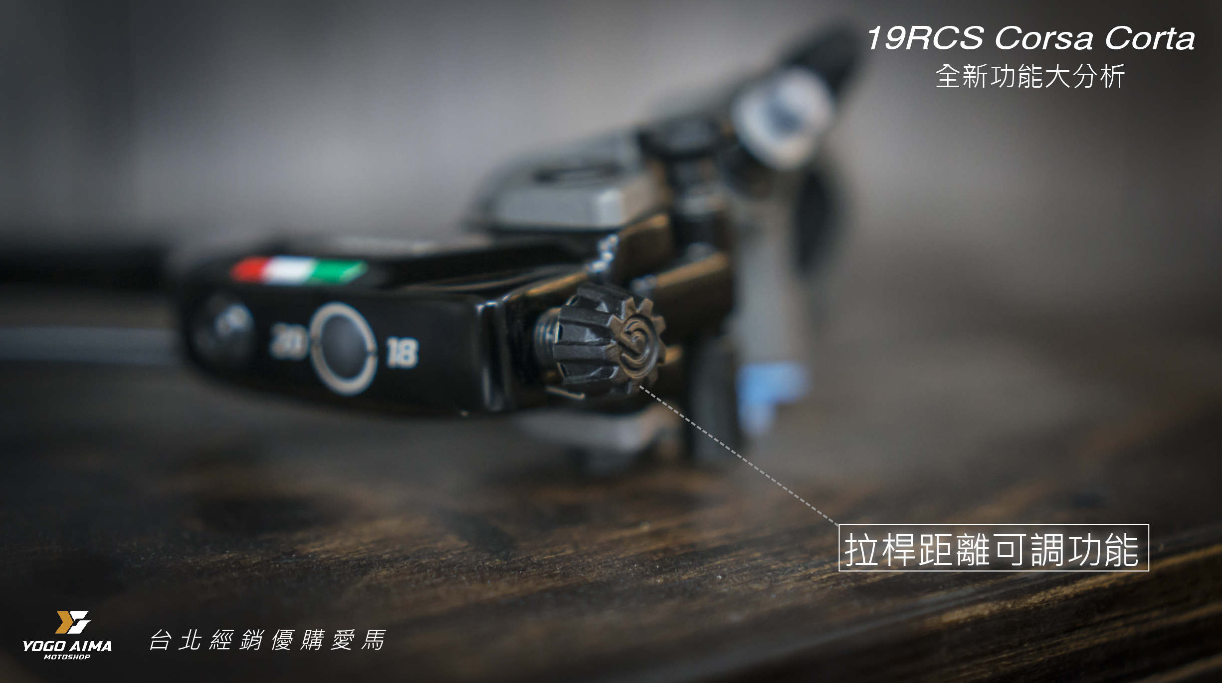全新的19RSC Corsa Corta在這次注入了全新的設計,旋鈕下方的柱狀體上有三個不同深淺的溝槽,透過柱狀機構旋轉來調整拉桿與活塞的距離來給總泵預先施壓,因改變活塞距離而減少煞車皮與碟盤之間的距離,藉此提高煞車精準度。