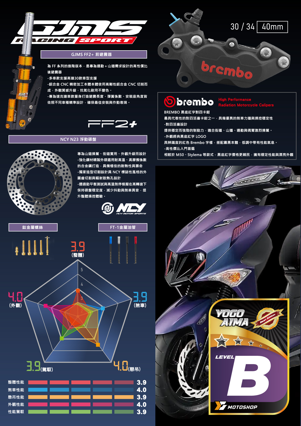 GJMS FF2+前叉,搭配Brembo基本版對四卡鉗與NCY N23浮動碟盤,量身優化。不論市區通勤還是假日山道小跑,懸吊穩定度與煞車手感全面提升,帶來更線性、可控的騎乘體驗。兼具舒適與操控,讓你輕鬆掌握每一次彎道與制動,感受進化的駕馭樂趣,成就日常與性能的完美平衡。