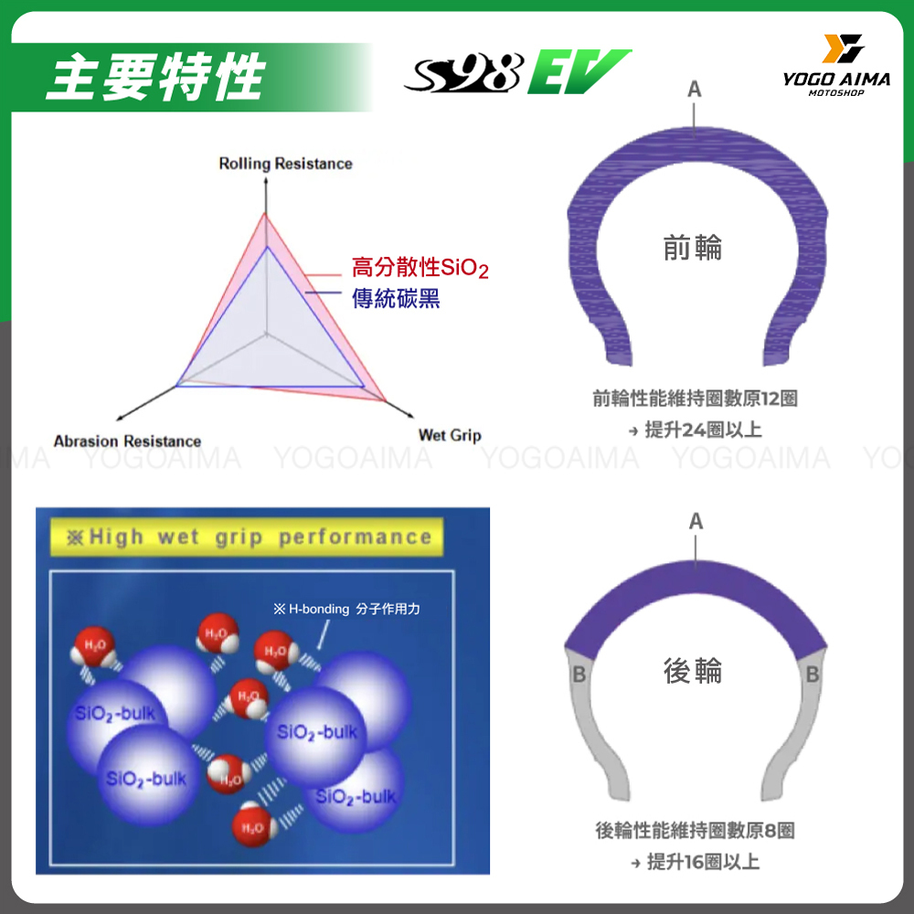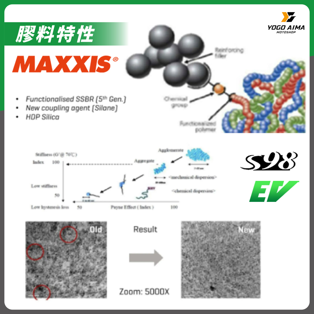 輪胎胎面膠料導入瑪吉斯奈米級高白煙配方大幅提升濕抓性能增強雨天行駛中車輛安定性。於濕地低μ路面可縮短煞停距離及擁有良好濕地操控表現。